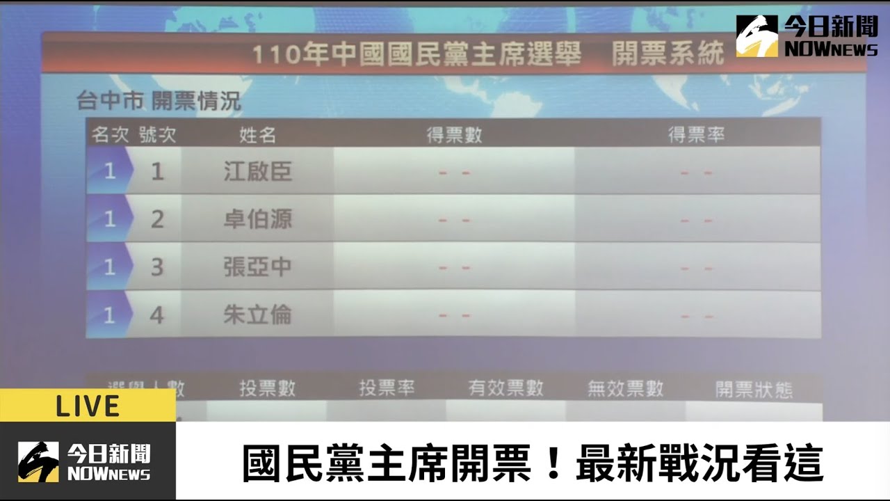 國民黨主席選舉今天投票共有約 37 萬黨員擁有投票權黨務人士上午說天氣不錯預估投票率會有5成左右最快下午6時結果就會出爐國民黨主席改選尋求連任的黨主席江啟臣前主席朱立倫孫文學校總校長張亞中前彰化縣長卓伯源4人角逐今天上午8時至下午4時投票全台共分. 國民黨主席選舉今天投票共有約37萬黨員擁有投票權黨務人士上午說天氣不錯預估投票率會有5成左右最快下午6時結果就會出爐 國民黨.